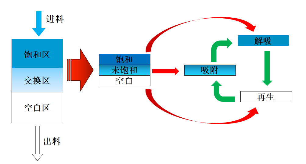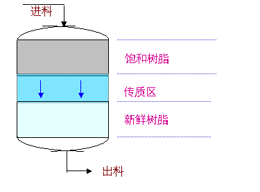 首先从分析固定床的离子交换过程着手,以说明连续离交工艺技术的特点和优势。图4为典型的固定床离子交换过程示意图。当操作一段时间后,树脂床将分为三段,即饱和区、传质区和新鲜树脂区。随着运行时间的延长,传质区在不断下降,直至床层的底部被传质区穿透后,整个树脂床层失效,然后切换至下一步骤。从这个动态过程可以看出,固定床离交过程存在着树脂的利用率低,整个床层只有传质区的少量树脂在工作,大部分树脂处于非传质的闲置和等待状态;并且,大量的物料或洗脱剂(再生剂)需穿过或浸泡已经失活的树脂层,造成了对树脂的料负荷污染。