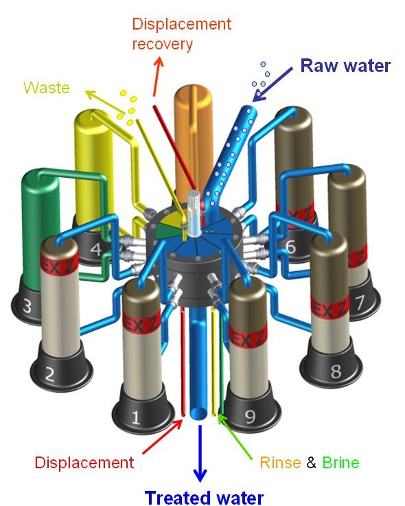 2.减少水和化学品的耗量,减少污水排放。连续离交技术每一步骤中的多个树脂柱可以按照工艺的要求,串联或并联连接,树脂柱之间没有死角。在洗脱和再生操作中,几乎可以按化学计量的理论量进行工作,显著地降低了化学品和水的用量。