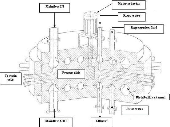 为了吸收电磁阀切换模拟移动床维护简便以及转盘式移动床树脂效率高的优点,Puritech公司开发出了第三代移动床技术---IONEX连续离交技术。IONEX系统使用一个多功能阀(图1所示)来取代模拟移动床系统繁复的电磁阀组,实现料液的切换分配和交换过程的连续进行,不仅硬件设施变得更为简单,而且控制程序也更加简易,因而生产管理非常便利;同时,IONEX系统保留了转盘式移动床多个树脂柱轻松切换的优点,可以实现40个以上树脂柱的有效切换,而又无需体积巨大的转盘带动,维护方便。所以,IONEX技术实现了设备功能效率与简易性的统一,是新一代的移动床技术。