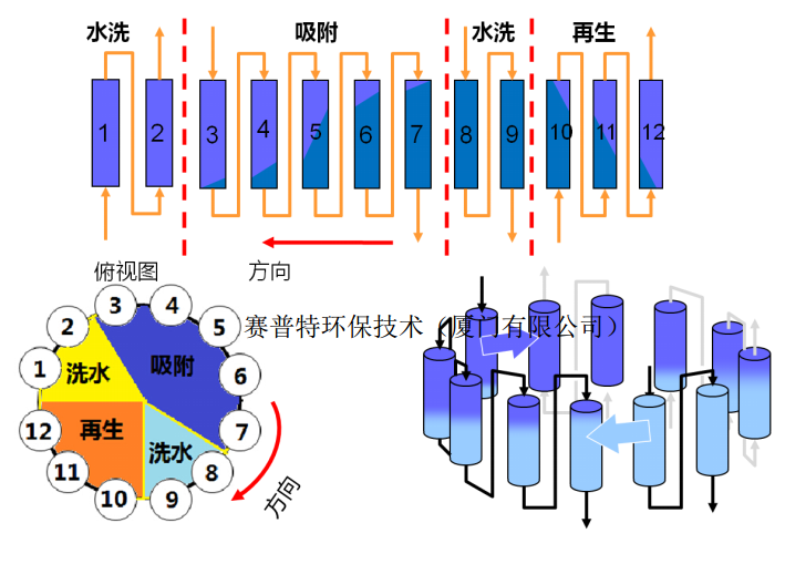 连续式离子交换系统正是根据这一理念而设计的。如图6所示,它将固定床传质区横切为若干个小段,每一段做成一个独立的小树脂柱,这些小树脂柱依次排列,和固定床中的情况一样,物料则按照1、2、3、4、5 的顺序依次通过各个小树脂柱(以 12 柱为例,实际工业设备为 20 柱以上)。但不同的是,当7号柱吸附饱和后,可以立即离开吸附区送去再生,而2号柱是已经再生好的新鲜树脂,则补充进入吸附区,从而将一个间歇的过程变成连续的工作过程,效率得到大大的提高。